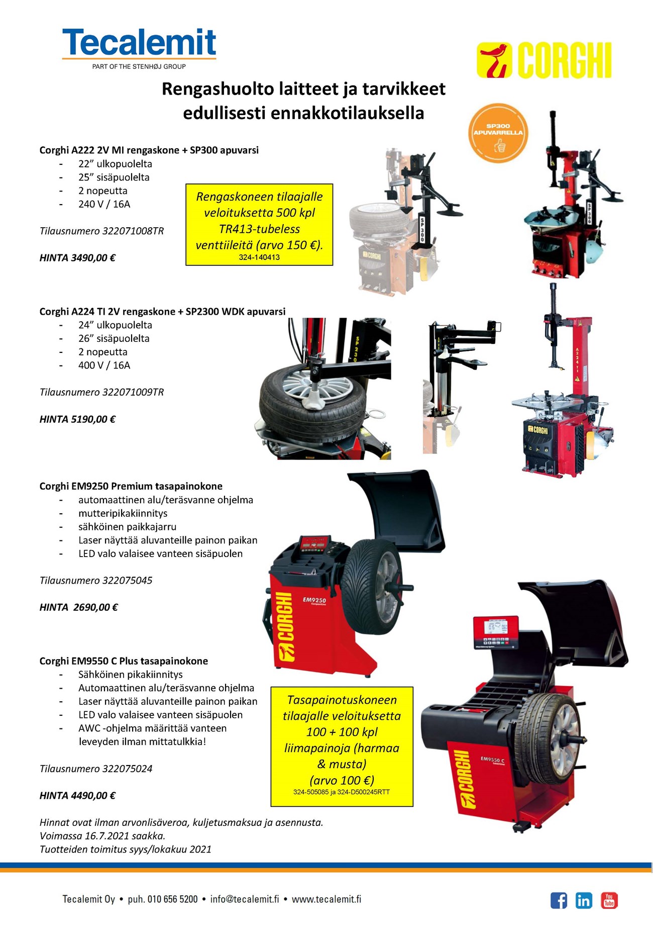 Nyt kannattaa olla ajoissa liikkeellä, sillä Corghin suosituimmat rengashuoltolaitteet ja -tarvikkeet myydään nyt todella edullisesti, kun teet tilauksen 16.7.2021 mennessä.