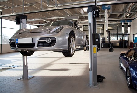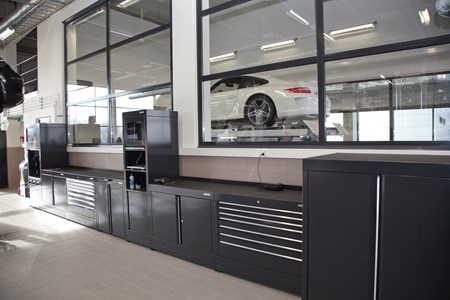 DURA-korjaamokalustein varustettu Porsche-huoltokorjaamo.